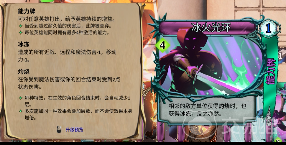 “冰火光环”不参与直接输出,却深刻重构了战斗维度。其效果为强制使相邻敌人同时进入灼烧与冰冻双重异常状态。若先由烈焰扇+或火焰召唤施加灼烧,则周边单位立即冻结,大幅限制其行动与输出频率;反之,若前置施加冰冻,亦可反向触发灼烧扩散机制。这种双向联动机制,使原本单一的灼烧体系跃升为兼具控场强度与伤害延续性的复合型打法。