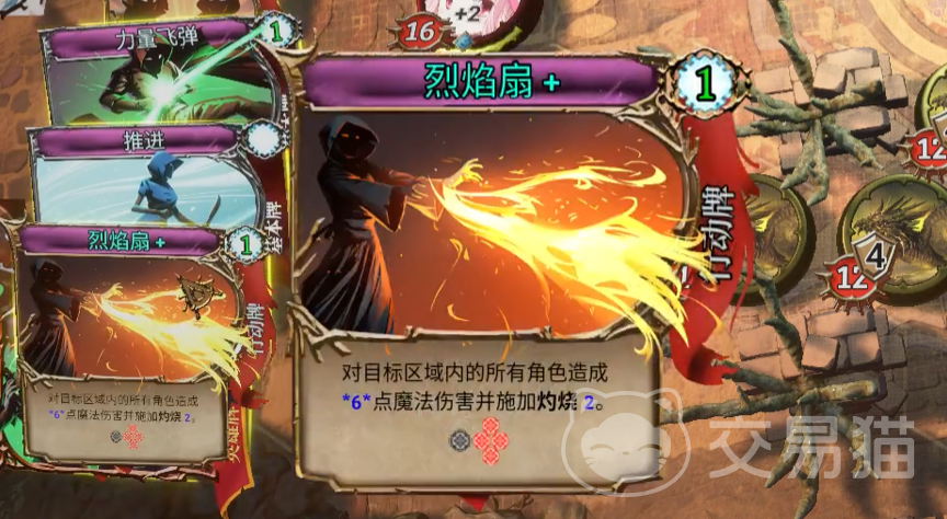 “烈焰扇+”是整套构筑的核心输出节点。作为一张行动牌,它消耗仅1点能量,即可对目标区域内的全部单位造成6点魔法伤害,并附加2层灼烧效果。结合萨满法杖+提供的额外伤害加成,该卡不仅具备高效的清杂能力,更能稳定铺叠灼烧层数,为后续连锁反应奠定基础——每层灼烧均可能触发天赋、装备或其它卡牌的响应效果,实现伤害滚雪球式增长。