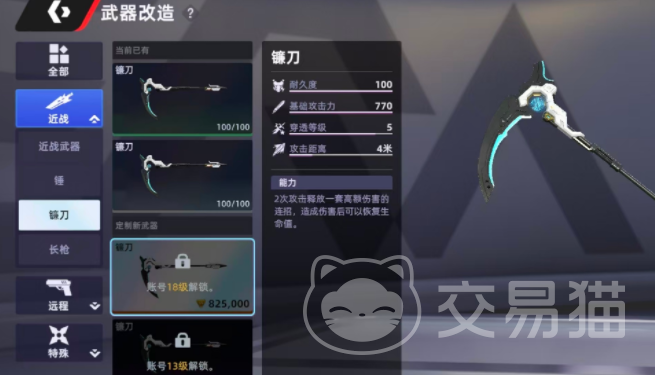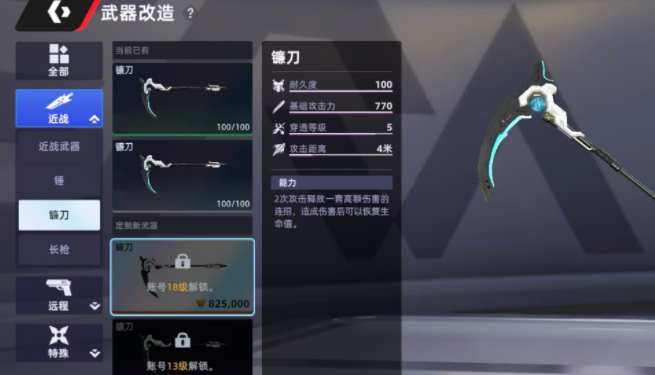尽管远程枪械在多数交火场景中占据主流,但在狭窄空间或突发遭遇战中,冷兵器往往具备不可替代的优势。镰刀作为近战体系中的标志性武器,虽攻击范围受限,但单次命中可同步触发生命值回复效果。其基础耐久与攻击力数值处于近战武器第一梯队,特别适合在战斗初期快速建立压制。连续两次挥砍可激活强化连击,造成显著爆发伤害,并依据实际命中量按比例恢复使用者生命值,形成攻防一体的循环机制。