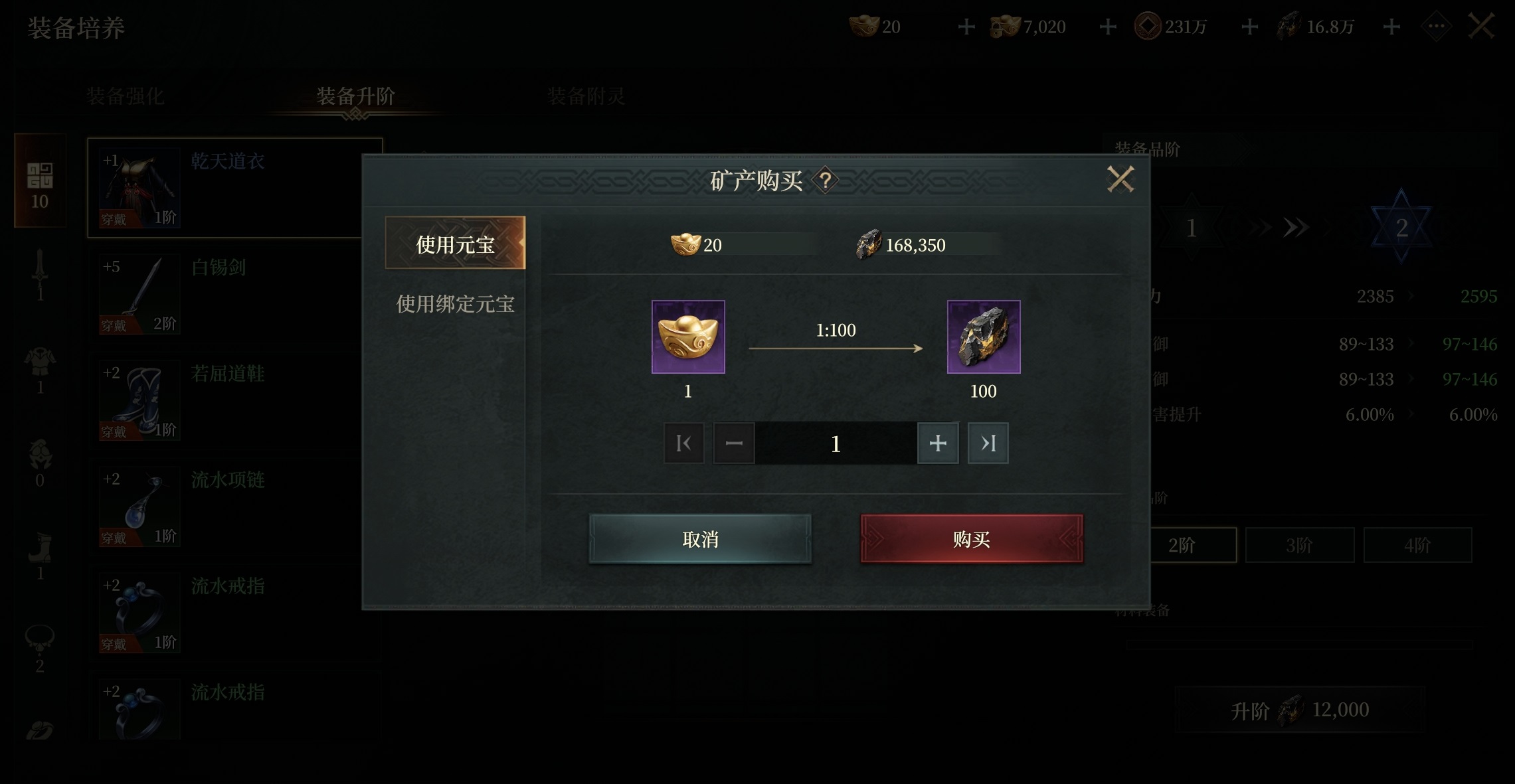 商城兑换适用于资源紧急调配场景。玩家可在“材料商店”中使用元宝或绑定元宝直接购入玄铁,兑换比例为1元宝=100玄铁。由于该方式成本较高,不建议作为常规获取手段。建议仅在以下情况启用:完成某件关键装备的最终升阶(需消耗海量玄铁)、参与限时跨服活动前集中补足资源缺口,或因特殊事件导致日常产出临时中断。需特别注意,玄铁核心用途为装备升阶——两件同名同品质装备合成时,除需匹配装备外,还需消耗对应数量玄铁,且随品阶提升,单次升阶所需玄铁量呈阶梯式增长,因此中后期资源储备压力显著增大。