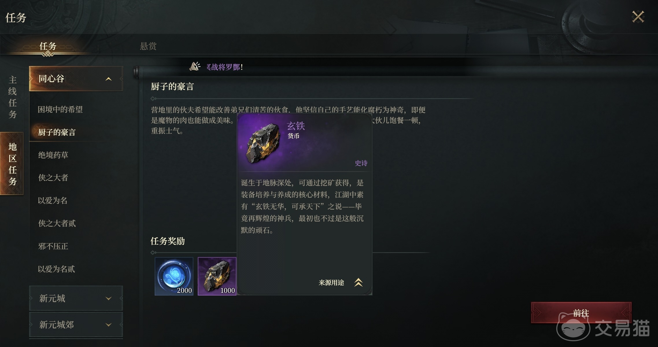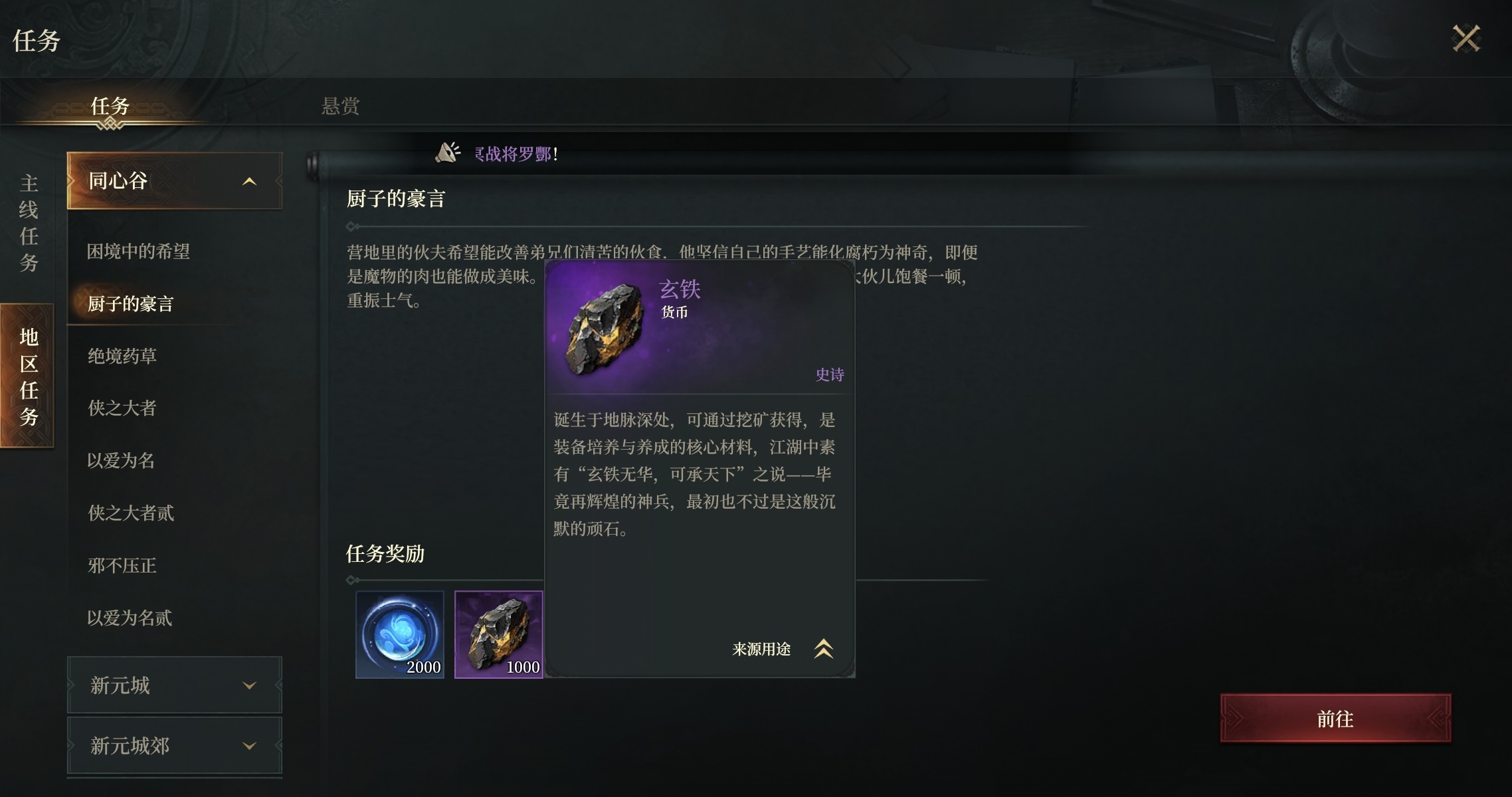 任务系统是前期玄铁最集中的来源。主线剧情任务在推进等级过程中会自然发放大量玄铁,属于成长过程中的伴生收益;当主线进度暂告一段落时,建议立即切换至“地域探索”模块,该板块整合了各地图区域的支线委托,任务链完整、奖励丰厚,且多数任务仅需简单交互即可完成。清空地域支线不仅能加速角色等级提升,还可同步获取玄铁、经验药剂及稀有图纸等多重资源,实现效率最大化。