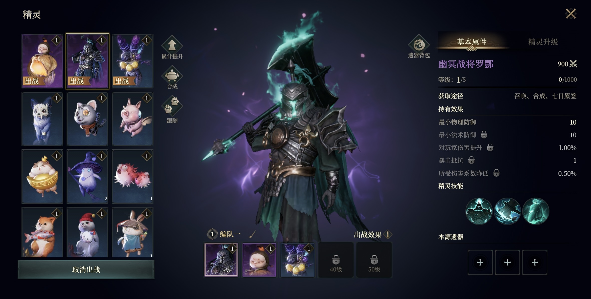 爱之魔女则定位为长效续航型精灵,攻击时有概率恢复自身最大生命值3%;受击时亦有概率为全体友方单位生成相当于其最大生命值15%的护盾。该机制大幅降低药剂消耗,尤其适用于长时间挂机或副本攻坚场景。完成四金配置后,第五位推荐选用紫色品质的幽冥战将——该精灵可通过常规途径免费获取,其技能可同步提升物理攻击上下限与法术攻击上下限,泛用性强,适配所有职业体系,有效补足整体输出维度。