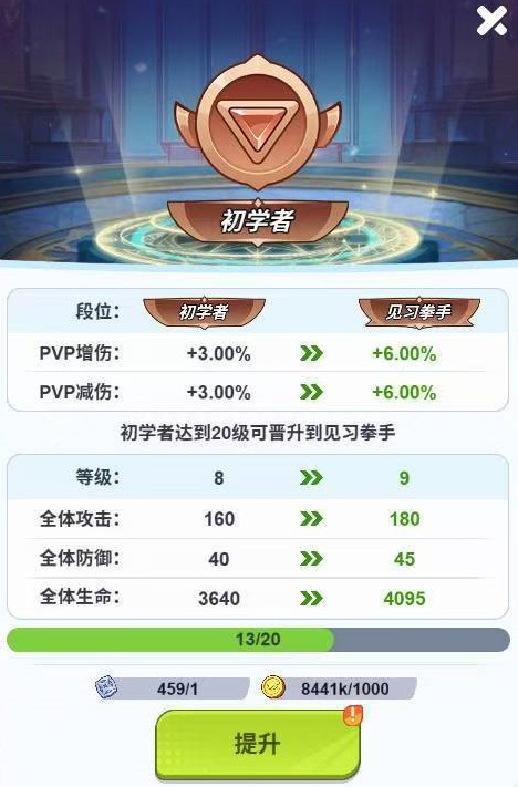 格斗场关联荣誉段位系统,段位提升可带来基础属性加成;更关键的是,每晋升一个段位,将激活专属PVP增伤效果。该增伤为百分比类型,在所有PVP场景中全局生效,虽单次增幅数值有限,但叠加角色本体属性后,实际战力差距显著放大。针对冲分效率,推荐采用“结算窗口集中攻坚”策略:在每日或每周结算前,预先储备20–30张入场券,于结算倒计时阶段高频发起挑战,最大化锁定排名位置,降低被反超风险。