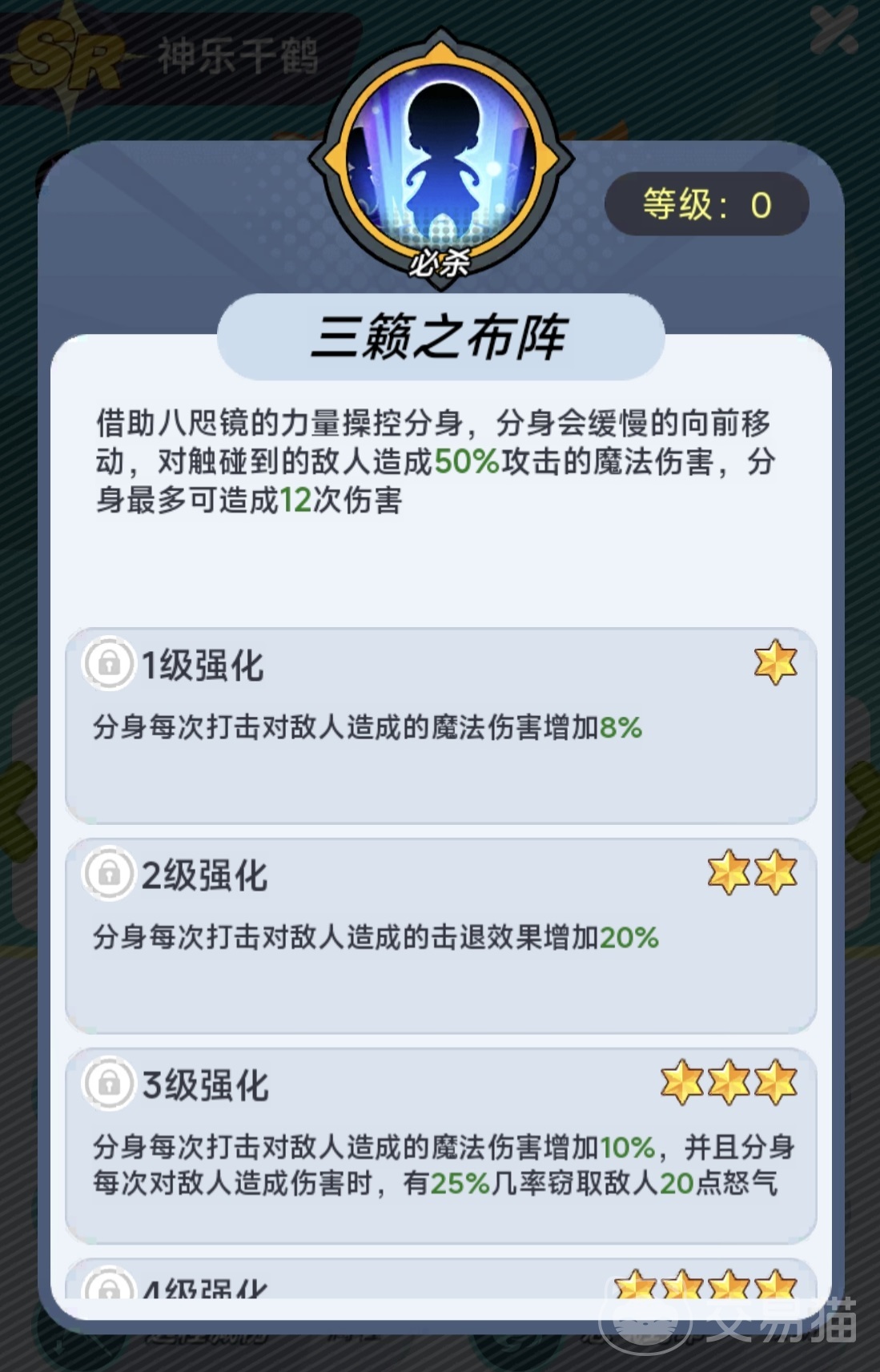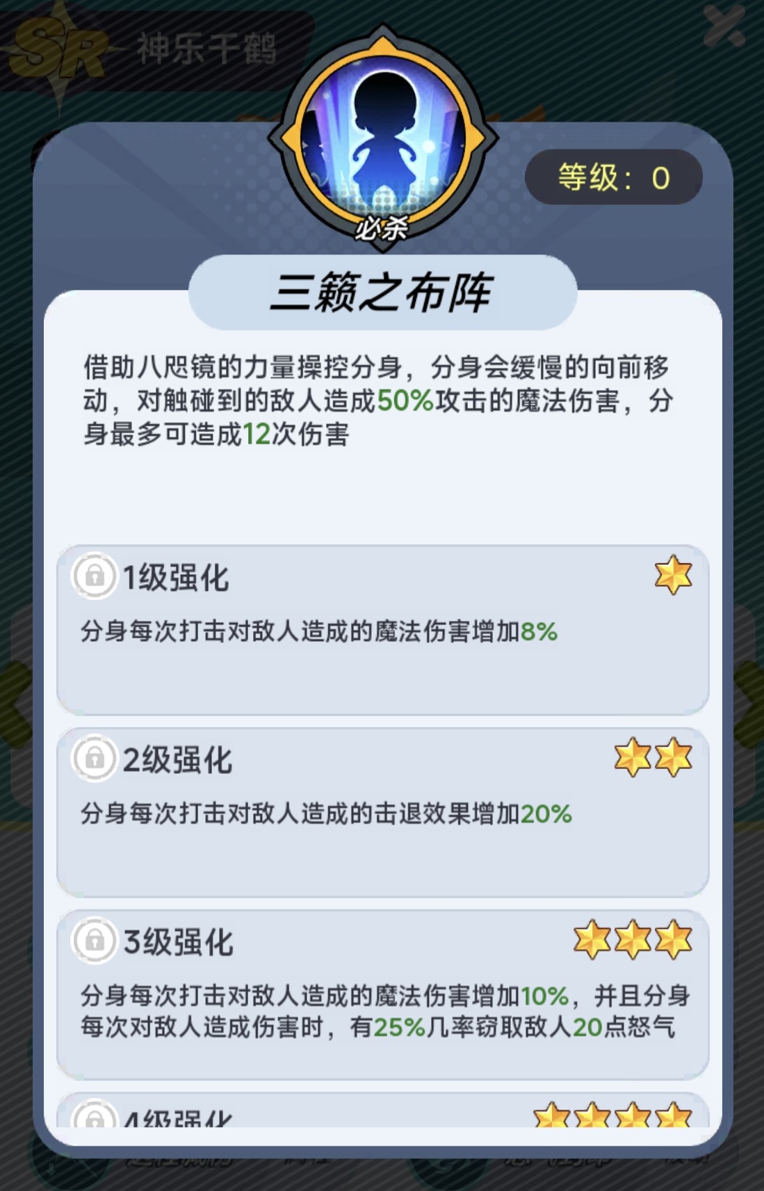 神乐千鹤的奥义技“八尺琼勾玉”可召唤多个分身缓速前移,接触敌人后触发魔法伤害。升星后,每次命中伤害提升,并附带击退效果;同一目标累计受击达4次时,将被施加1.5秒沉默状态。该机制使其在PVP对战中具备显著干扰能力,在PVE副本中亦能有效打断精英怪技能释放节奏。