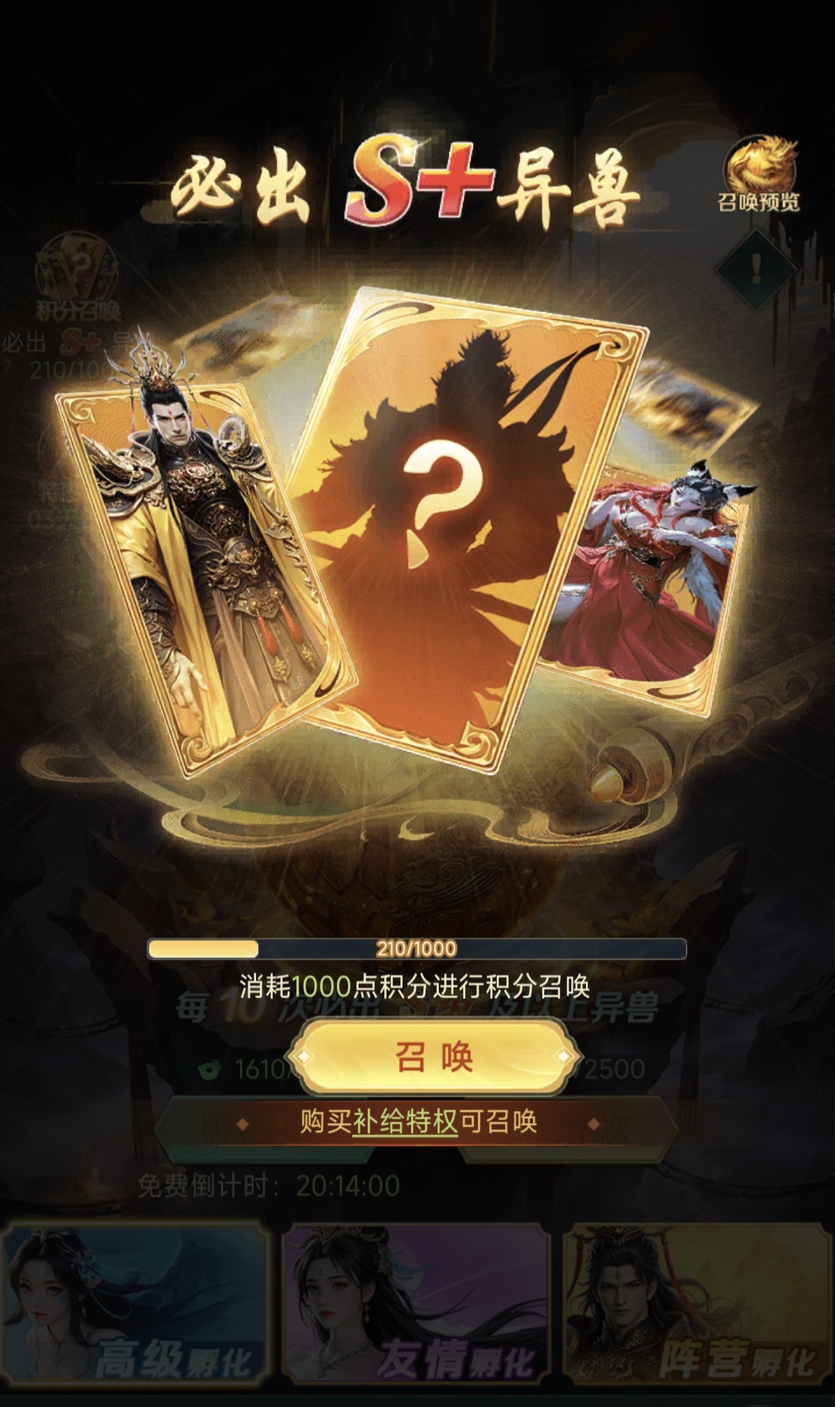 实战中,玩家高频使用的孵化渠道集中于高级孵化池与阵营孵化池。除上述10连保底外,每次高级孵化还可额外积累10点积分,友情孵化单次则获2点积分。这些积分将统一汇入“积分召唤”系统,成为获取S+阶顶级异兽的唯一常规途径——需提前购入补给特权方可激活该功能。合理积攒积分,可在关键节点实现高性价比的角色突破。就基础概率分布而言,高级孵化池内三星异兽出现率为80%,四星为15%,五星为5%;友情孵化池五星出率仅为1%,因此其定位更偏向资源过渡与友情点消耗,不建议作为主力获取渠道。阵营孵化池虽无独立保底,但在对应阵营角色池中具备概率加成,适合中后期围绕成型阵容进行精准补强。