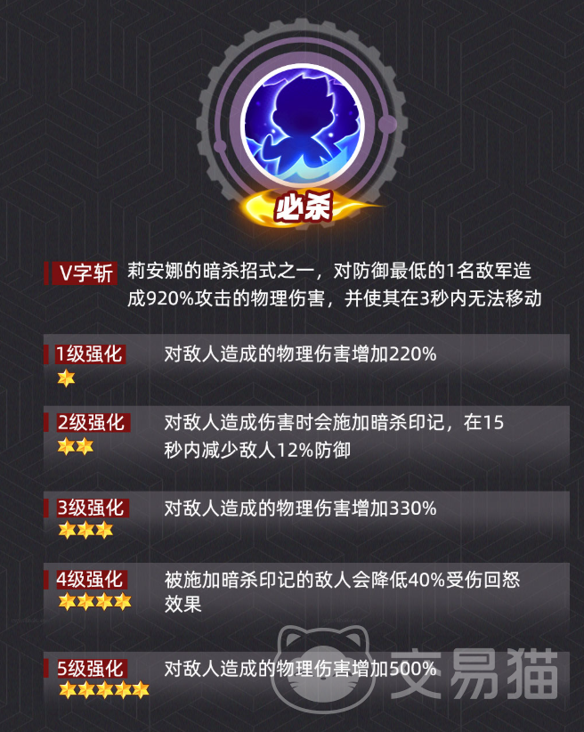 必杀技“V字斩”是其核心竞争力所在。该技能具备智能锁定机制,自动选取敌方防御最低目标,对后排脆皮构成持续威慑。伤害数值稳定达到920%物理攻击力(暴击状态750%),并附加3秒禁锢效果。这一组合确保了高爆发、高命中、高战略压制三重优势,使其在版本迭代中始终保有强势地位。
