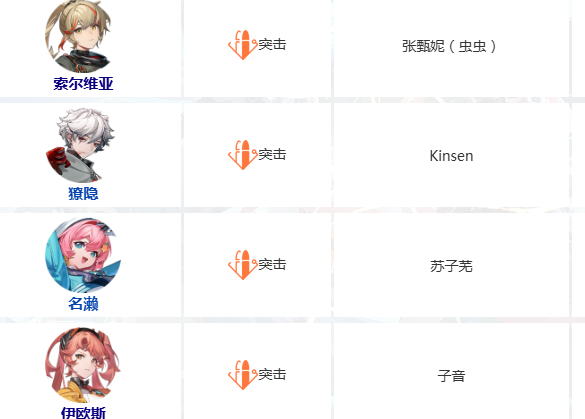 突击位角色数量较多,包括希、索尔维亚、獠隐、名濑、伊欧斯五人。每位角色拥有差异化的输出节奏、位移方式与技能组合,适合不同操作习惯与战术思路的玩家选择。