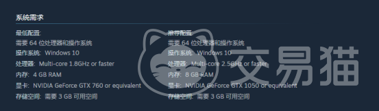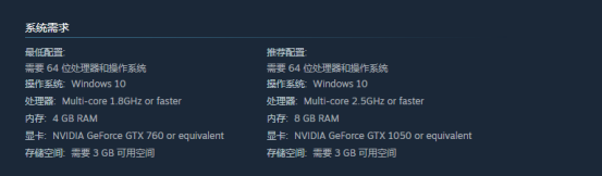 游戏最低系统要求为:64位Windows 10操作系统;处理器需支持多核心且主频不低于1.8GHz;内存容量不少于4GB;显卡需达到NVIDIA GeForce GTX 760或同级水平;硬盘预留空间至少3GB。若追求更高画质与更顺滑的操作反馈,推荐配置为:Windows 10 64位系统;多核处理器主频2.5GHz及以上;显卡升级至NVIDIA GeForce GTX 1050或更高规格。
