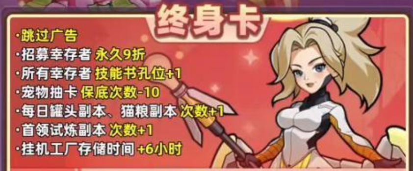 首先,终身卡提供全程无广告干扰体验。玩家可随时跳过所有激励视频及插页广告,保障决策节奏不被中断,显著提升战斗部署、物资调度等关键环节的操作连贯性。其次,该权益直接优化稀有资源产出路径——包括高稀有度角色获取概率加成、每日限定资源领取上限提升、以及关键养成材料的稳定产出保障。这使得玩家在应对第15天起的资源瓶颈期时,能更高效完成战力跃迁,为通关前的关键阶段争取战略主动权。