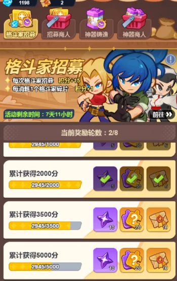游戏采用三周为一周期的结构化活动循环,各阶段目标明确、资源导向清晰,构成战力成长的主干路径。第一周聚焦【招募活动】,以高星格斗家碎片及招募券为核心产出,是组建主力阵容的关键窗口;第二周进入【神器活动】,榜单排名依据神器培养总进度(含强化、升星、共鸣等维度),强调对现有装备体系的精细化运营;第三周开启【奥义活动】,主要发放奥义密转卷与觉醒石,直接关联角色终极技能解锁与质变升级。三类活动严格按序轮替,形成“获取—强化—升华”的完整养成闭环,确保玩家能力维度均衡发展。