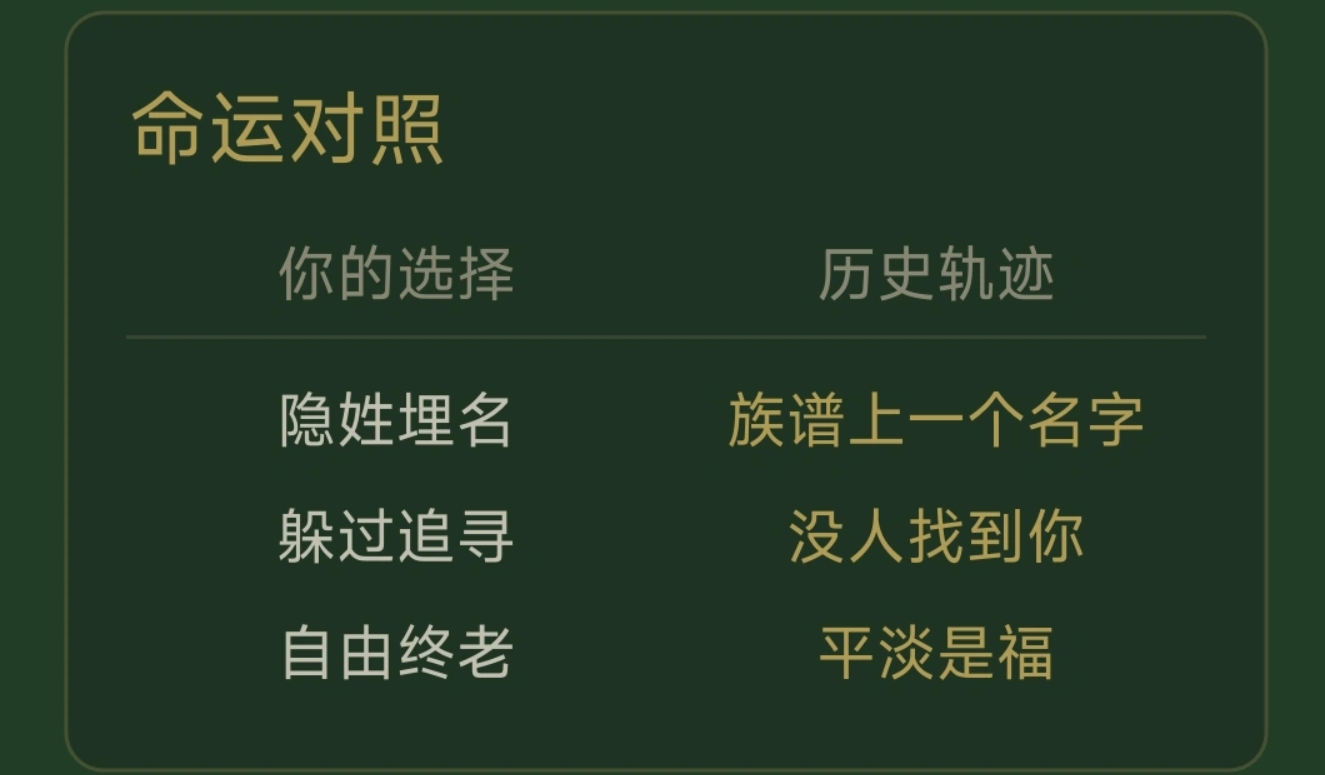 游戏弱化传统竞技对抗机制,无PVP、无排行榜、无强制在线匹配,更适合偏好静心阅读与自主思考的用户群体。文字不仅是信息载体,更是命运操控界面——每一个选项背后都承载着逻辑闭环与因果反馈,赋予玩家切实的“人生主导权”。达成古代语境下的非传统成功路径(如归隐山林、执掌商道、著书立说等),将带来强烈的情绪满足与叙事成就感。节奏明快、结构清晰、代入感强,是本作最突出的核心体验特征。
