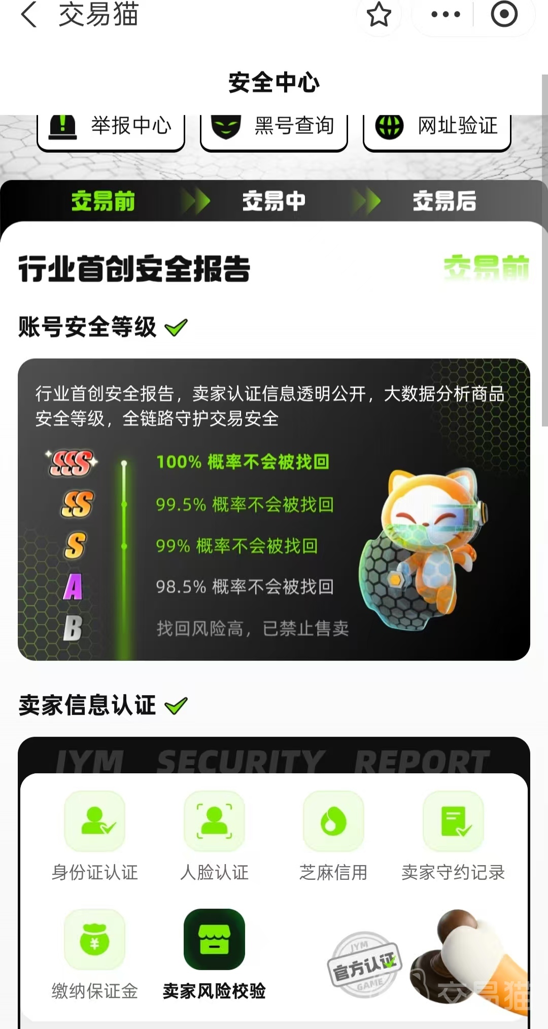 在平台上进行交易安全是有绝对保障的,因为交易猫是阿里巴巴灵犀互娱旗下平台,还是目前业内唯一一个送永久包赔的软件。况且平台要求所有卖家必须先完成实名认证、人脸识别和芝麻信用核验,只有三项都合格了才能将王者游戏账号挂上去售卖,这样卖家们卖号的时候就不用提心吊胆了。