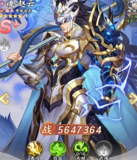 第二位是魂·赵云。该形态下,其输出具备持续叠加特性:每层武魂加成均可提升后续伤害倍率,并同步增强队伍生存能力。1魂阶段即可获得基础减伤效果;随着魂阶提升,必杀技将解锁护盾生成、伤害抑制及敌方属性削弱等多重效果。尤其在高魂阶(如3魂以上)时,其控场与反制能力显著增强,属于攻防一体的战术枢纽型武将。