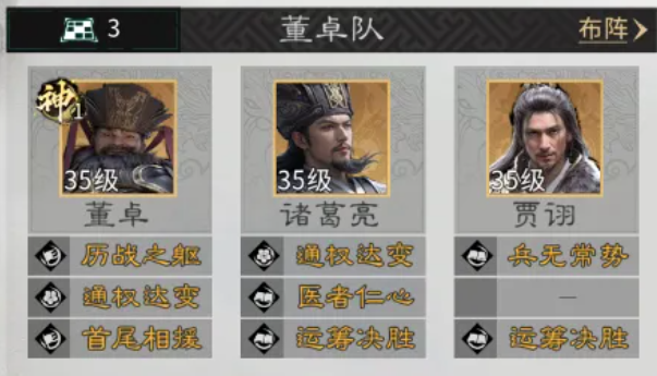 核心三人组为贾诩、诸葛亮、董卓。三者均未经历削弱性重做,其控制链逻辑清晰、资源需求合理:贾诩提供混乱主控与能量反哺,诸葛亮负责智力压制与状态加速,董卓则承担统率转化与挑衅牵引。在获取路径上,该组合无稀有橙将或限定卡池依赖,常规抽卡即可成型。