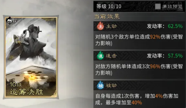 诸葛亮装备选择侧重状态联动,“运筹决胜”优于“通权达变”:每次承伤提升4%伤害,叠满10层后总增益达40%,显著放大其智力压制与牵制触发收益。该增幅直接作用于“料敌机先”的伤害结算与控制判定,使整套控制链兼具强度与容错。