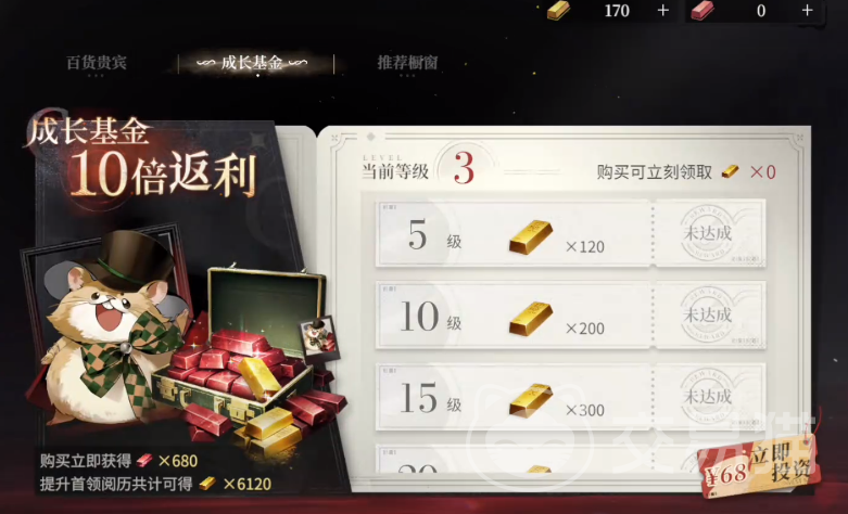 追求长期回报的玩家可考虑68元成长基金,该档位提供10倍返利机制:充值即得680红砖,后续随角色等级提升分阶段解锁共计6120金砖。金砖发放与等级严格绑定,1至60级每升一级均可领取对应数量,形成持续稳定的资源补充节奏。