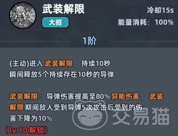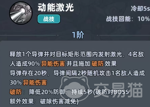 其核心机制围绕“自动索敌+持续挂dot+多段破防”展开。主动技能“激光脉冲”冷却仅5秒,命中后对矩形区域敌人造成90%基础伤害,并附加持续10秒的20%破防效果——该减抗属性对Boss战尤为关键;同时发射的制导导弹可在战场停留20秒,每2秒自动锁定最近目标并造成30%伤害,面对连续刷新的杂兵波次时,清场效率显著优于需频繁手动瞄准的职业。