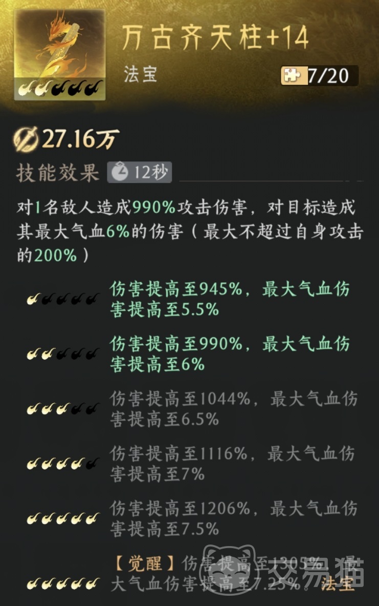 万古齐天柱作为第二输出选择,侧重于高血量目标压制。其基础伤害附带相当于目标最大气血值6%的额外伤害,面对Boss级单位时具备稳定增伤能力,尤其适用于需要多轮消耗的持久战场景。