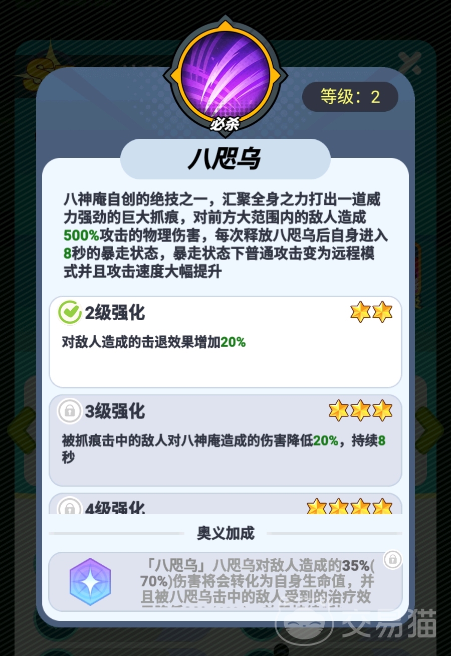 在《最强斗王》中,八神庵作为高人气SR级御守型格斗家,凭借出色的战场控制能力与持续作战韧性,成为中后期阵容构建的关键角色。他可通过战技触发强化普攻,大幅提升基础输出,并附带减疗效果;激活奥义加成后,该强化普攻还能将部分伤害转化为自身生命值,显著增强生存能力。释放必杀技时,不仅能造成高额倍率伤害,更可使自身进入持续8秒的狂暴状态——期间普攻转为远程、攻速提升,并配合强力击退机制,有效压缩敌方站位空间,为团队范围技能创造更优命中条件。
