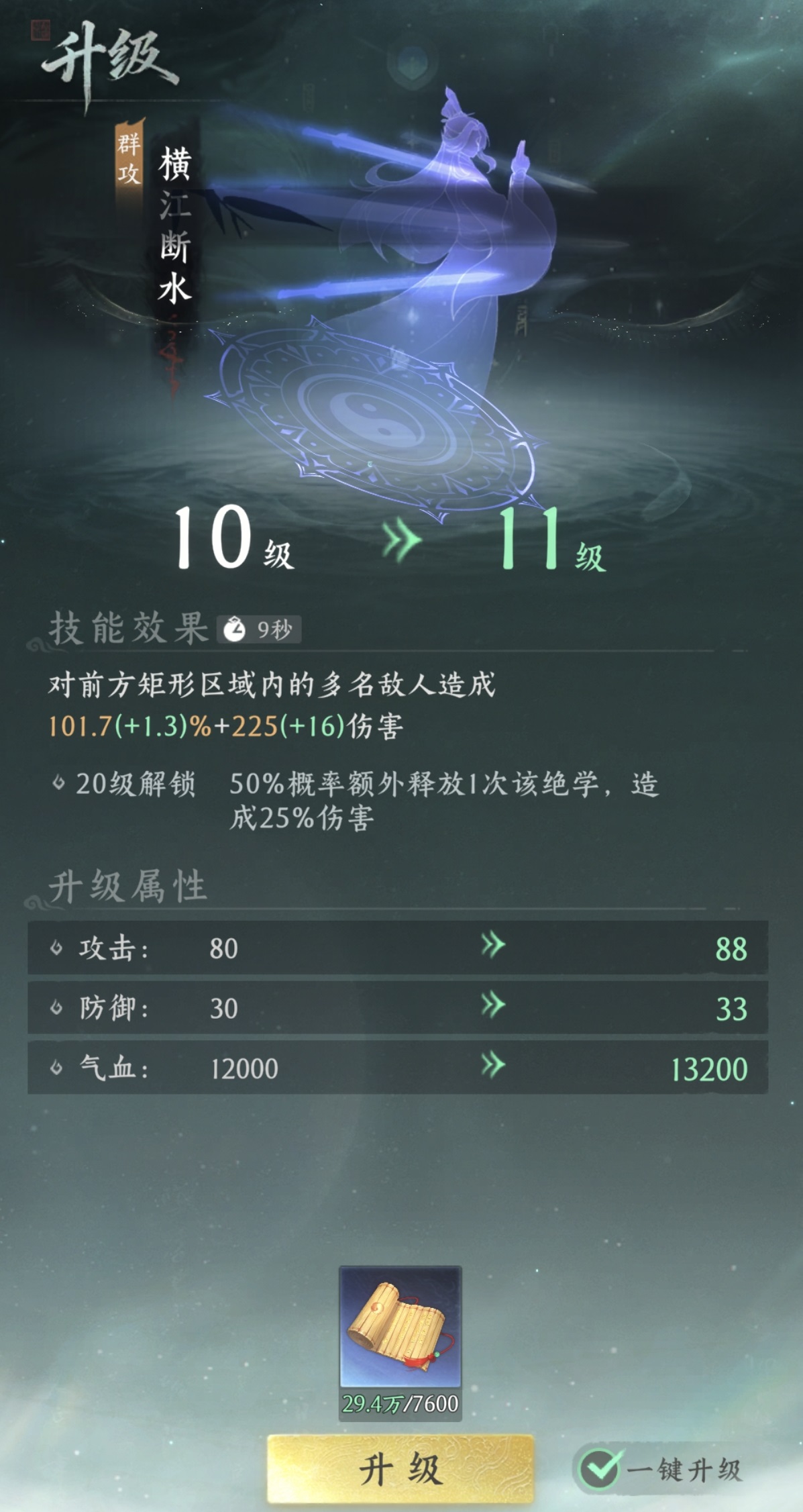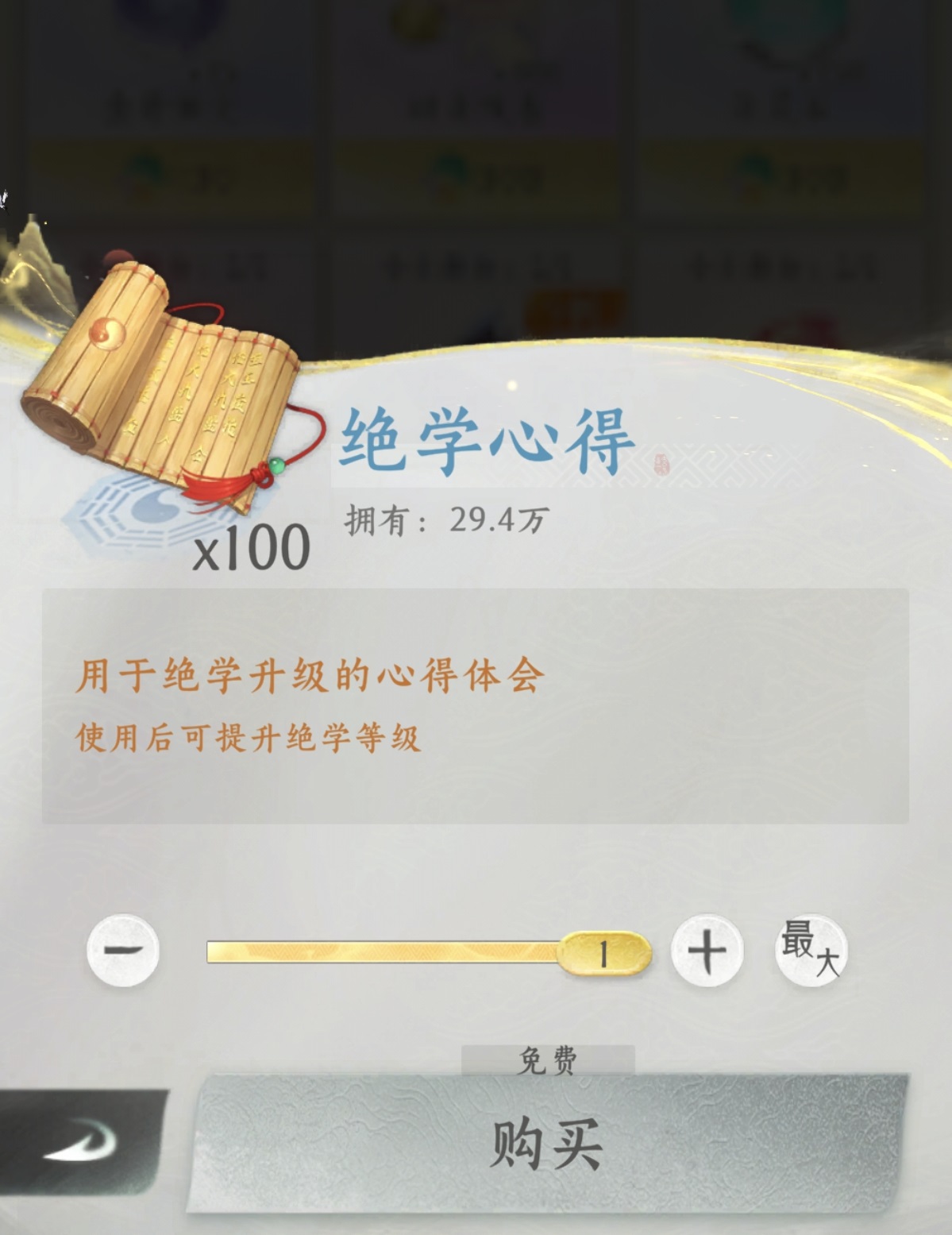 进入角色界面后,点击人物头像即可定位至“绝学”功能入口。初始阶段仅开放基础普攻类绝学,随角色境界提升,系统将逐阶解锁新绝学槽位——每晋升一个大境界,自动激活两个高阶绝学栏位。务必在境界突破后第一时间完成对应绝学的等级强化。绝学升级依赖核心道具“绝学心得”,使用后可获得专属经验,直接提升绝学等级;等级提升将同步增强攻击、防御、气血等关键属性。绝学心得主要通过镇妖塔挑战与商城采购两种方式稳定获取。