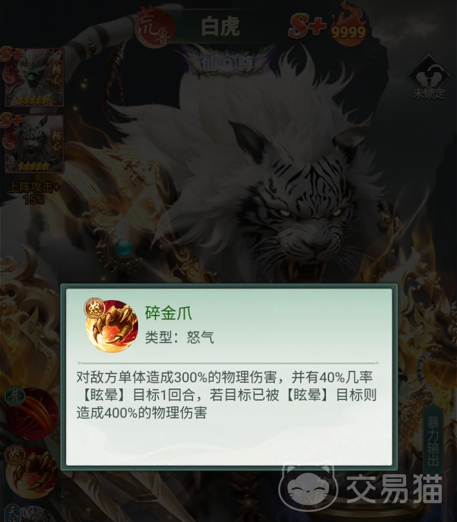 白虎的核心怒气技“碎金爪”具备极强的战术弹性:该技能对单一目标发动高额倍率伤害,并附带概率眩晕效果。尤为关键的是,若目标当前已处于眩晕状态,则本次碎金爪的伤害倍率将获得显著提升。这一联动机制既支持白虎自身通过连续施放构建控制链,也兼容队伍中其他角色的前置控场——队友成功眩晕目标后,白虎可立即接续打出更高额爆发,形成稳定的“控—打”节奏闭环。
