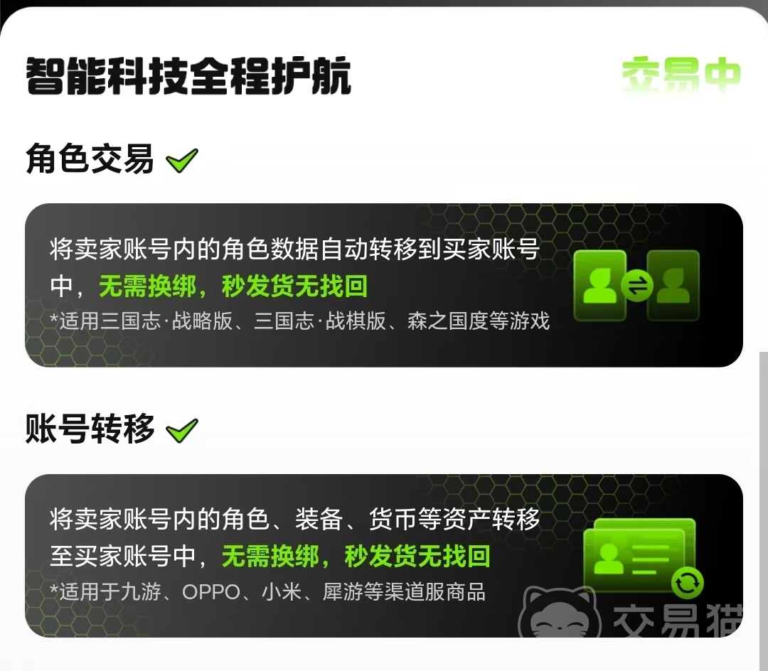 在交易的过程中,交易猫平台由智能科技全程护航,卖家账号里面的角色数据会自动转移到买家的账号中,期间无需换绑。买家付款之后,资金不会直接打给卖家,而是进入了平台监管账户,只有当买家完成了账号的登录验证,确认账号的相关内容和信息无误、确认收货之后,款项才会结算到卖家的账户里面。这样做可以有效防止私下交易时出现付款后失联、交易后找回的不良现象发生。所有交易都有平台在线交易人员跟进执行且24小时在线,即使是新手小白第一次买号也不必担心。