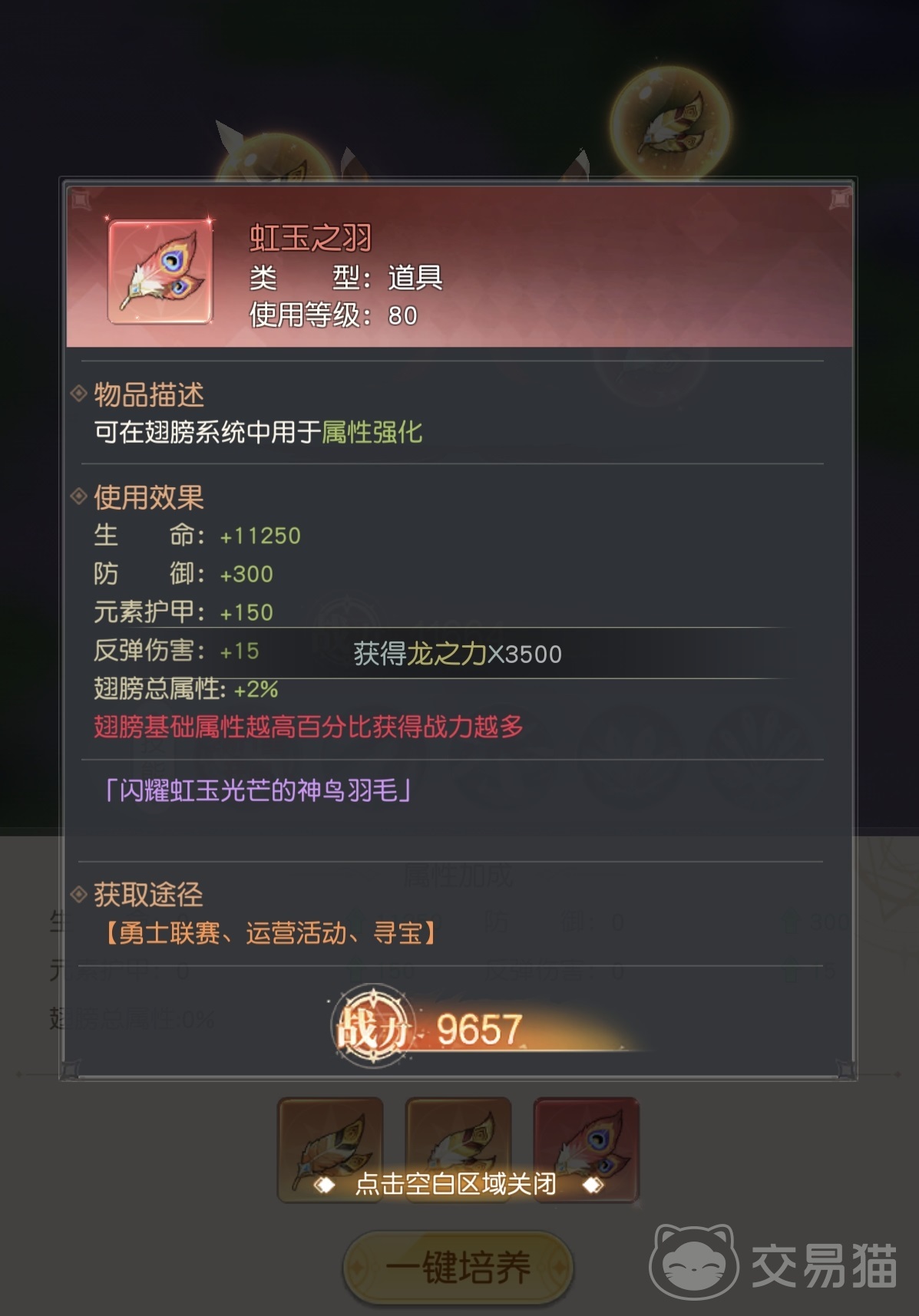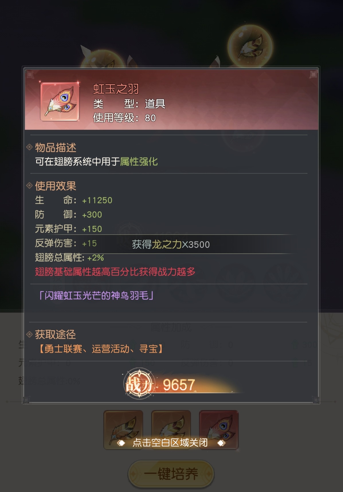进入主界面后,点击【进阶】功能入口,即可看到【坐骑】与【翅膀】两大独立养成分支。选择翅膀后,系统将展示当前已装备的翅膀形态、星级、阶数及祝福值进度。翅膀的成长路径清晰明确:先通过消耗翅膀精华提升祝福值,满值后自动升星;每累计达成10星,即可触发进阶操作,解锁更高阶位。随着阶数提升,将逐步开放专属技能栏位;技能初始解锁后,需配合对应【翅膀技能书】进行效果强化。此外,【翎羽】是关键稀有资源,包含金铂之羽、虹玉之羽、刚玉之羽三类,分别用于强化生命、防御等基础属性;其中虹玉之羽具备全属性百分比加成效果,为最高阶增益材料。当翅膀达到指定阶数时,可使用【升星卡】实现一键升星;若当前阶数超出该卡适用范围,则自动折算为等量祝福值,确保资源不浪费。