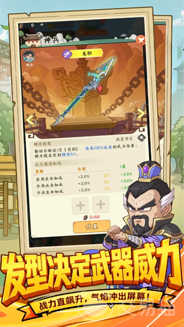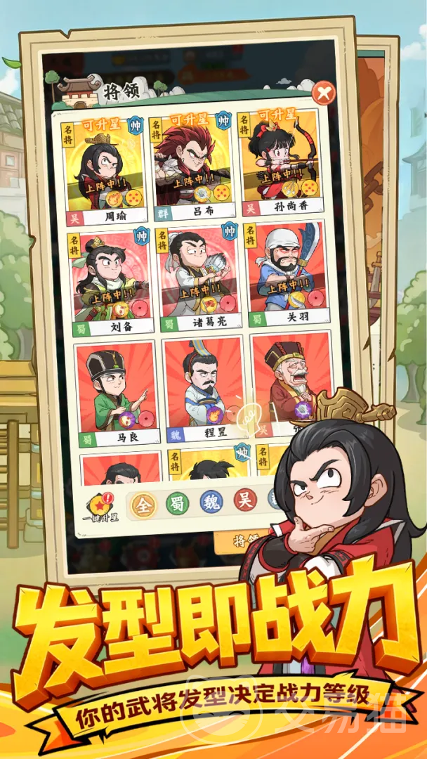 美术风格兼具简约与趣味性,所有武将均采用原创魔性立绘,角色拥有独立技能机制、成长路径及数值体系。玩家可通过抽卡、活动、副本等多种方式获取卡牌,并借助升级、进阶、升星、装备强化等系统持续提升战力,打造专属核心阵容。