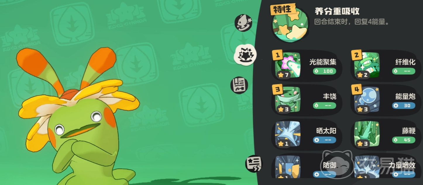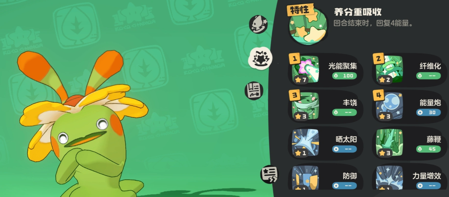 奇丽花主打能量循环与技能强化双轴运转:“重吸收”提供回合结束回复3点能量的基础续航,首领化后升至7点;配合“纤维化”(减伤70%)与“光线聚集”(每次使用草系技能后本技能威力永久+60),可形成攻守兼备的滚雪球节奏;面对克制属性对手(如地面、水系)时,“丰饶强化”提供灵活反制手段。