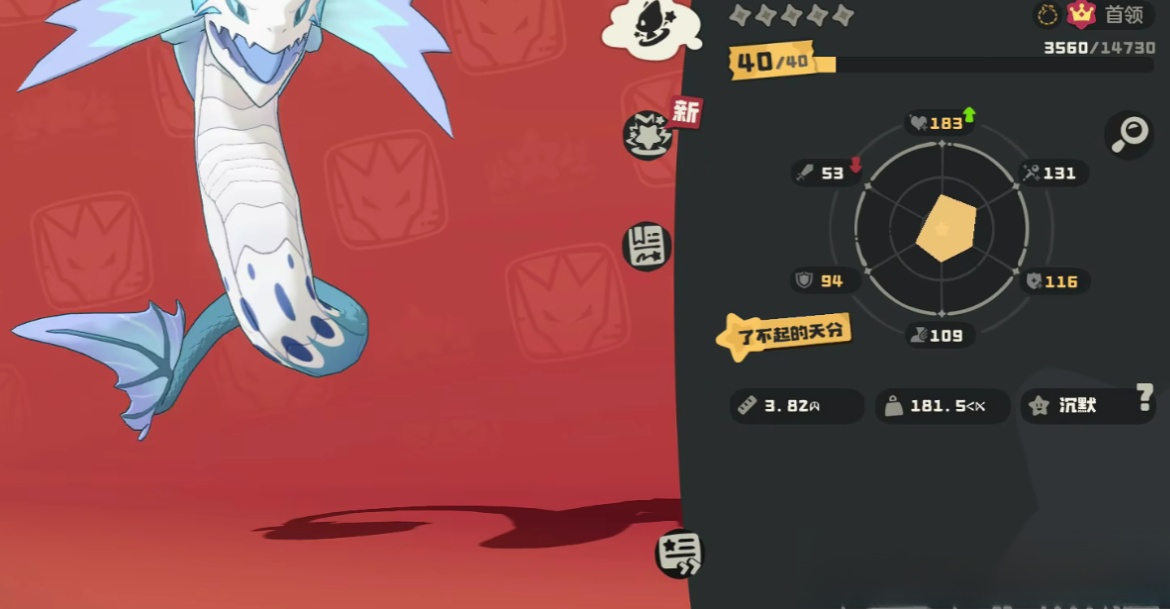 防御125与魔抗138的组合,使其面对单属性为主的物理队或魔法队时均具备稳定承伤能力。144点精力进一步强化其续航表现,在持久战中相较高攻低防型宠物更具战术容错率,不易被爆发伤害快速清场。