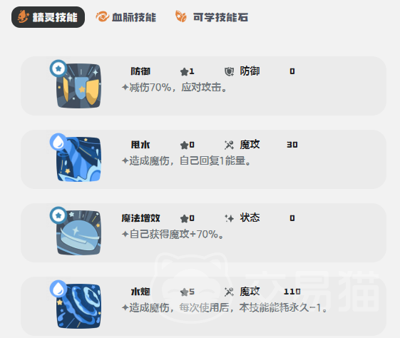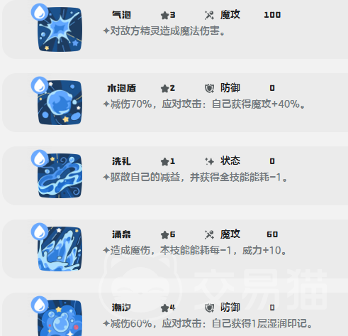 技能组合兼顾多维功能:输出端配备魔攻120的“水泡”,随使用次数增加而持续降低能耗,中后期可实现近乎无消耗的高频爆发;另有魔攻150的强力技能,配合状态类减耗效果(能耗-6),单次命中即具决胜潜力。基础技能如“气泡”“水弹枪”提供稳定伤害与控场延展;防御向技能如“潮汐”兼具团队增益与逆境反制能力,“防反”“蜡质膜”则进一步强化容错率与站场韧性,显著提升对抗针对性打法的能力。