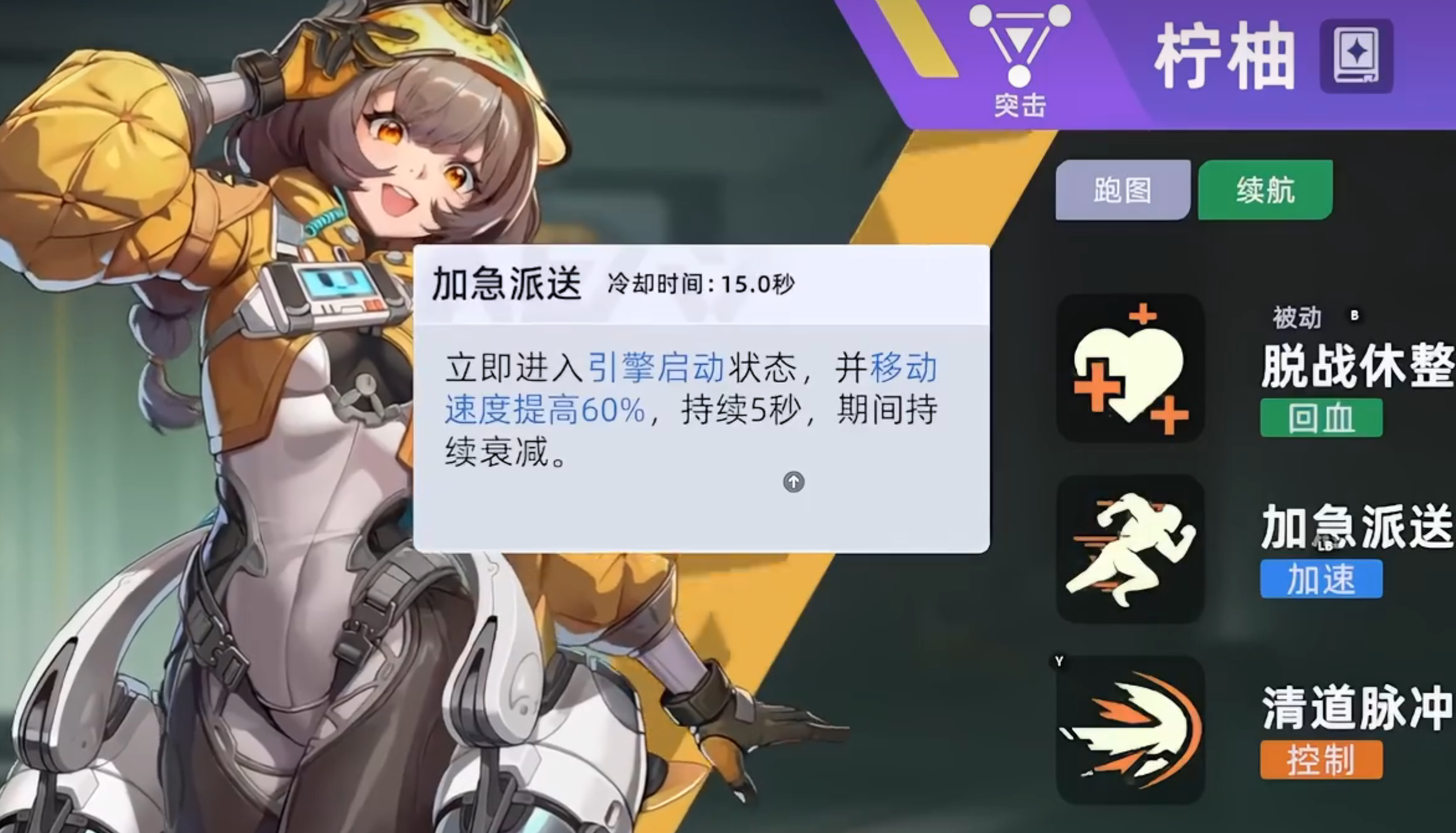 一技能“加急派送”是柠柚节奏掌控的关键:开启后瞬间获得60%移动速度提升,持续5秒,速度随时间线性衰减。该技能适用于快速抵达高价值点位(如保险箱)、紧急转点或脱离包围圈。二技能“清道脉冲”为前向直线冲击波,可击退路径上敌人;若在“引擎启动”状态下释放,技能作用范围扩大,且被击退单位撞墙后将陷入3秒眩晕。此为柠柚唯一控制手段,兼具反制、打断与地形杀潜力,在谷仓等结构紧凑的地图中尤为高效。