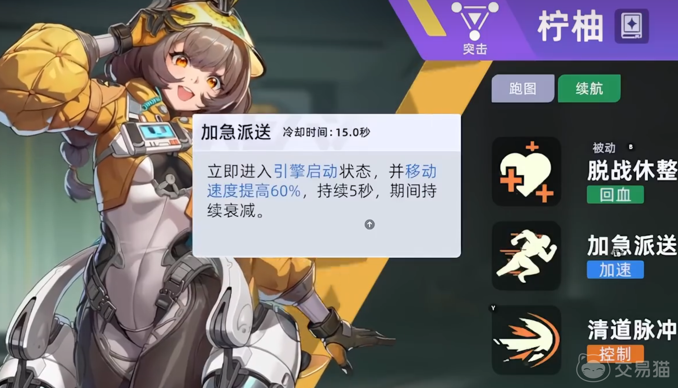 柠柚的核心打法围绕“非对称博弈”展开:不恋战、不硬刚、以资源获取效率为第一优先级。其被动技能名为“引擎启动”,在脱离战斗状态后自动激活,提供15%常驻移动速度加成,并附加每秒3%最大生命值的持续回复效果。该机制显著提升生存容错率——即便被集火压制,只需短暂规避至掩体后,数秒内即可恢复状态并重新建立位移优势。