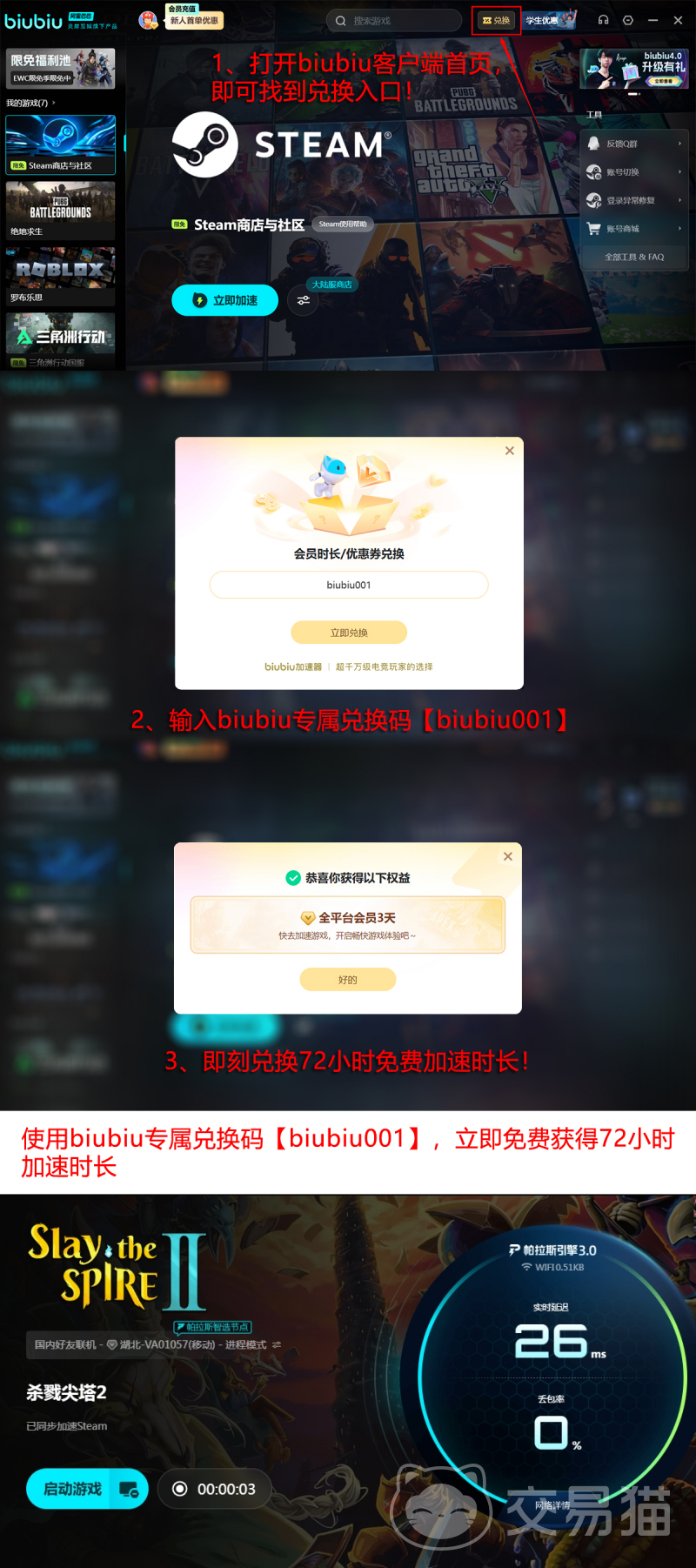 为保障高强度操作下的网络稳定性,推荐使用biubiu加速器。该工具由阿里巴巴灵犀互娱研发,与九游、交易猫同属其旗下产品矩阵,技术底层扎实,延迟控制优秀,可有效避免爬塔过程中的卡顿、掉线等问题。新用户注册后可领取24小时新手加速时长;所有用户输入激活码【biubiu001】,还可额外获得3天通用加速权益。两项福利叠加,总计可享96小时免费加速服务,充分覆盖多轮完整爬塔周期。