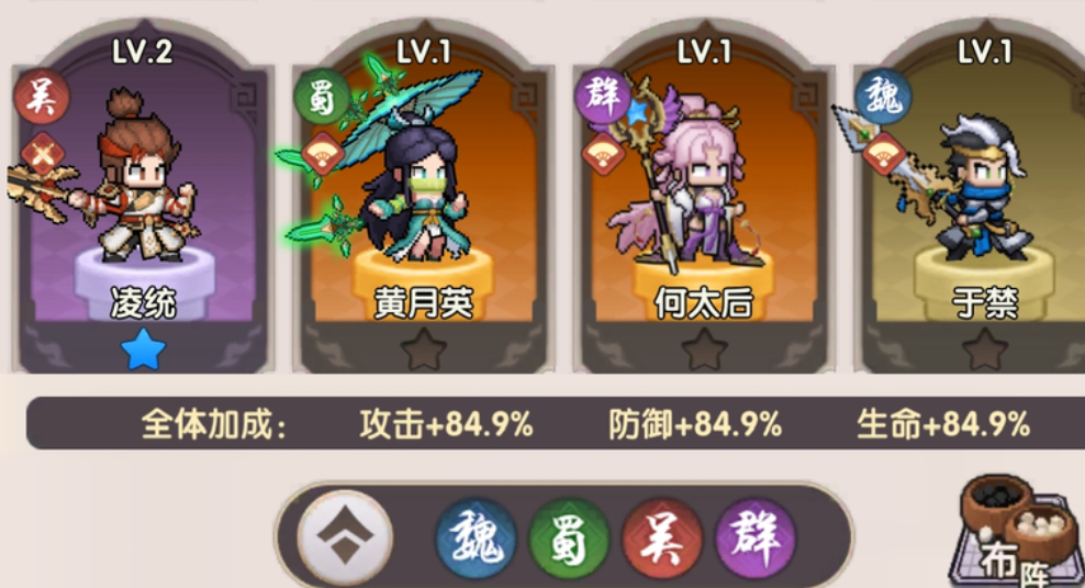 游戏内设四大阵营,各阵营拥有独立武将池与属性加成倾向,武将定位高度明确:如前排专注承伤、后排专注输出,构成六人小队的基础布阵框架。不同流派策略差异显著——暴击流侧重高频瞬发伤害;控制流依赖眩晕、冰冻等打断类技能压制敌方行动节奏;而周瑜领衔的灼烧流则通过持续伤害实现渐进式消耗。新手建议优先尝试暴击流,容错率高且成型较快。