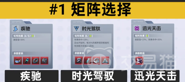 逆翎的大招为三段式群体攻击,每段命中均可驱散一个敌方增益效果,并附加“防御下降”与“削弱”类减益。当敌方处于虚弱状态时,其对我方造成的伤害将降低25%,这使得逆翎在对抗高威胁输出单位时具备天然反制优势。为保障其行动频次与状态覆盖率,矩阵配置建议优先确保其出手稳定性:一号位推荐选择“疾驰”,以维持基础行动概率不被稀释;二号位选用“时光驾驭”,兼顾生存与持续作战能力,可搭配荆棘、奋进等效果提升容错;三号位推荐“迅光天机”,提供命中与速度两项关键基础属性加成;四号位则可选用“疾影强袭”,进一步补足速度成长曲线。