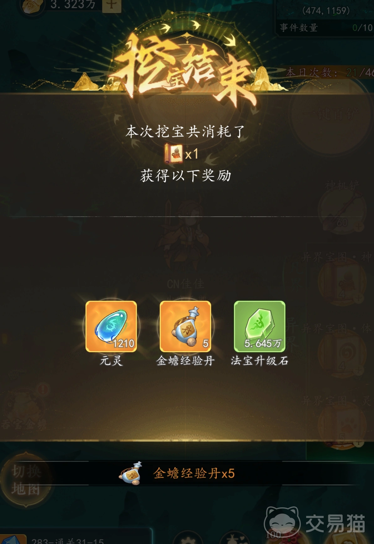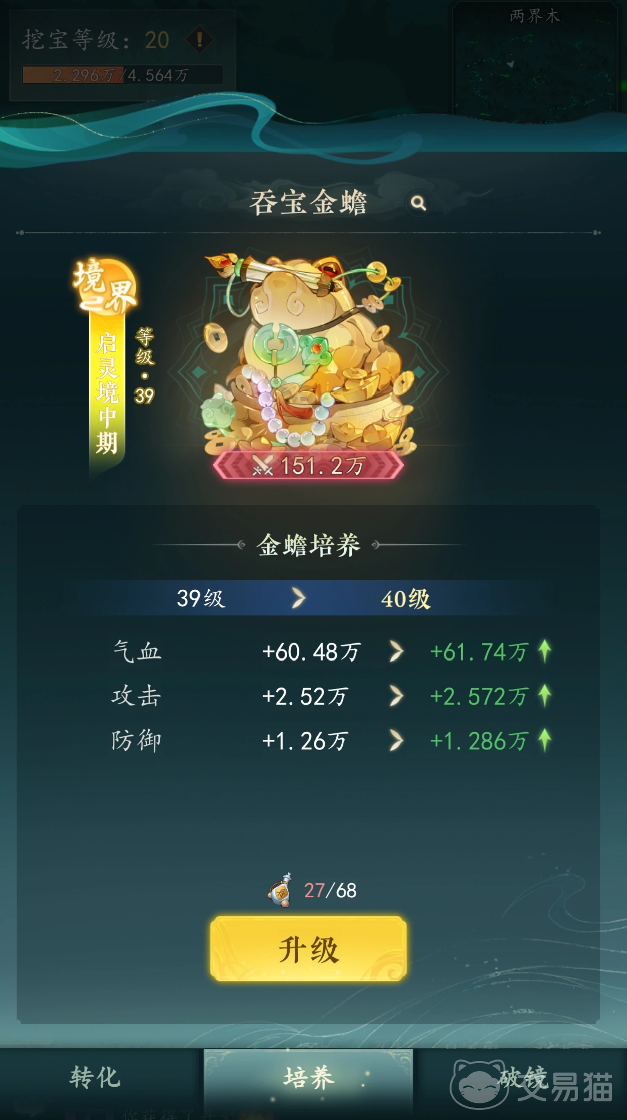 除宝图投喂外,等级提升同样不可忽视。金蟾战力释放高度依赖基础等级,而升级所需的经验丹可通过日常普通挖宝稳定获取;每日挖宝次数充足,确保养成节奏持续可控。当面临境界突破节点(如融元→化神)时,则需消耗破镜丹,该道具可在融元商店中直接兑换,无需额外刷取其他副本。