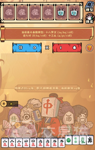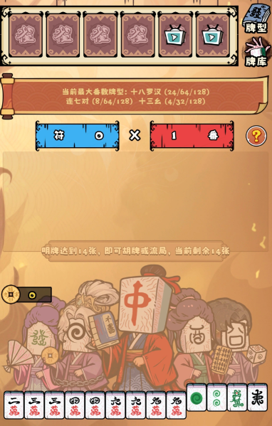 玩家需在每局中通过换牌、亮明、组合等方式构筑胡牌阵型,并依据番种计算得分。单局目标分数达成即视为通关。游戏虽沿用基础麻将逻辑,但策略维度显著拓宽:既可选择稳健积小番逐步推进,亦能主动触发高风险高回报的大牌机制,实现翻盘式爆发。