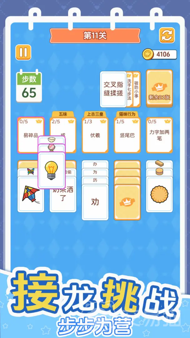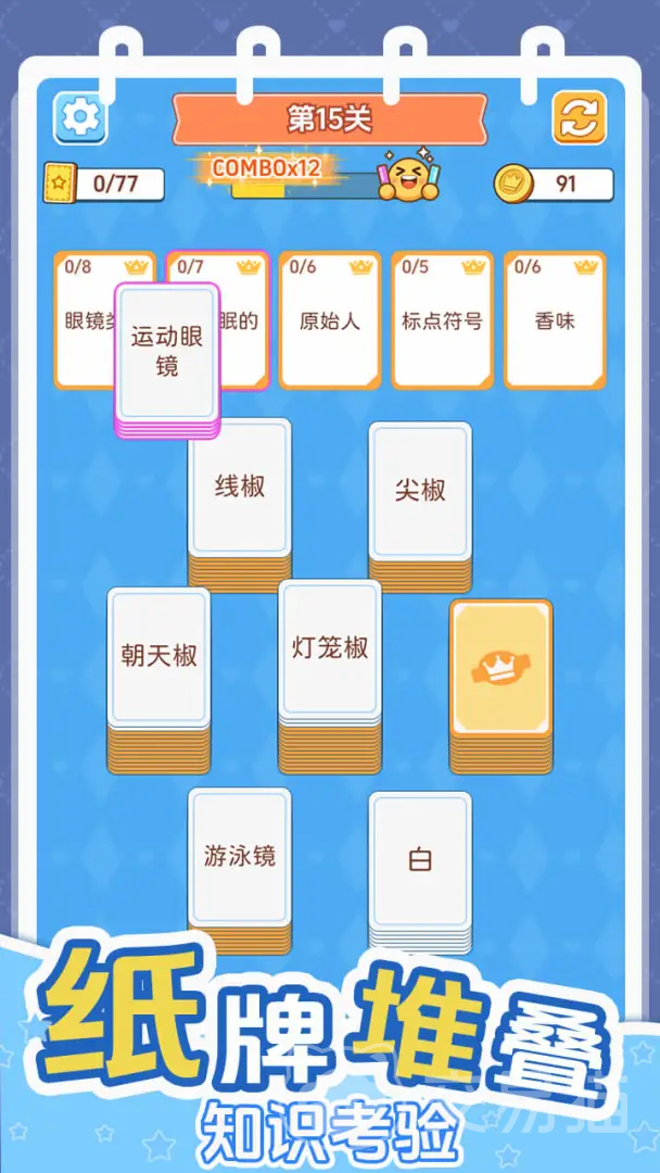 本作提供双轨解谜路径:其一为纸牌归类模式,玩家需通过拖动、腾挪与空位调度,完成同类型卡牌的系统性整理,锻炼空间推理与分类归纳能力;其二为序列接龙模式,玩家从牌库逐张翻牌,在步数限制下将匹配卡牌精准移入主题区域,强化前瞻性判断与资源统筹意识。两种机制互为补充,兼顾策略深度与操作友好性。