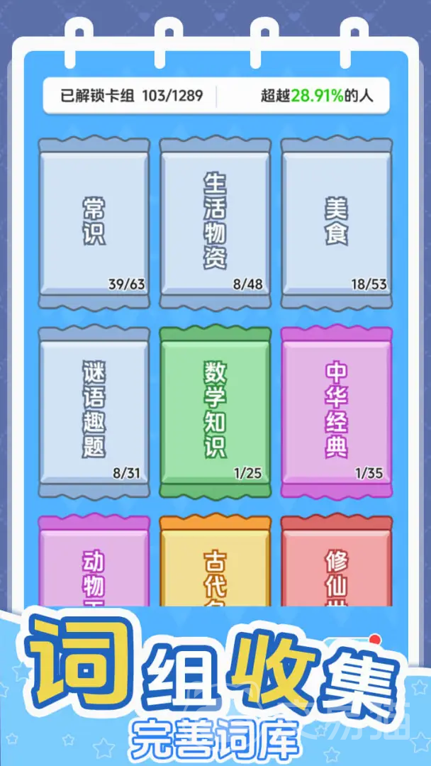 关卡体系采用阶梯式难度设计,随进度持续提升认知负荷,推动玩家突破思维惯性。独创“词组收集”系统贯穿全程——每完成特定组合即可解锁新词汇,逐步构建个性化词库,并有机会合成高阶神级卡组。这种可见的成长反馈机制,显著增强目标感与长期留存动力。