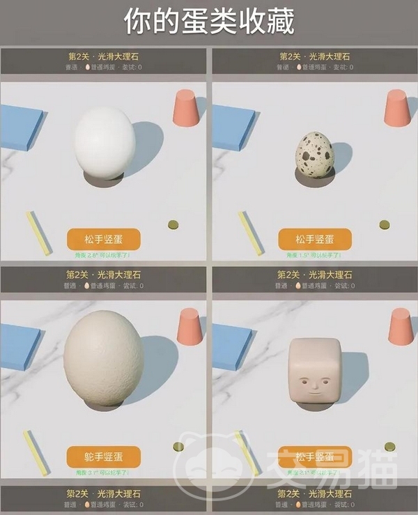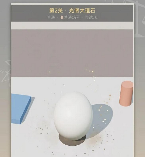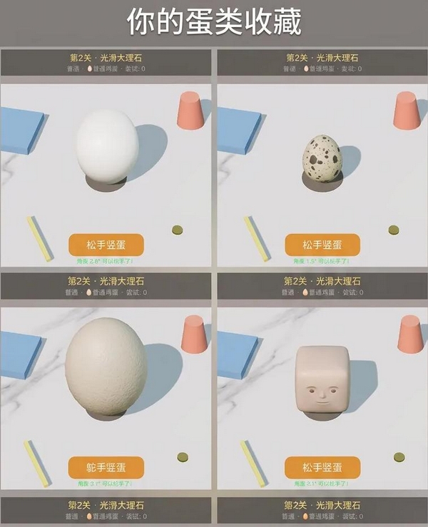 关卡设计围绕物理特性展开差异化布局:桌面材质涵盖高反光玻璃、低摩擦大理石、高阻尼木质及动态旋转基座;可操控蛋体类型包含标准鸡蛋、鹌鹑蛋、鸵鸟蛋、双黄蛋、方形蛋与金蛋六种,每种在质量分布、转动惯量及接触面反馈上均存在显著差异,构成系统性难度梯度。