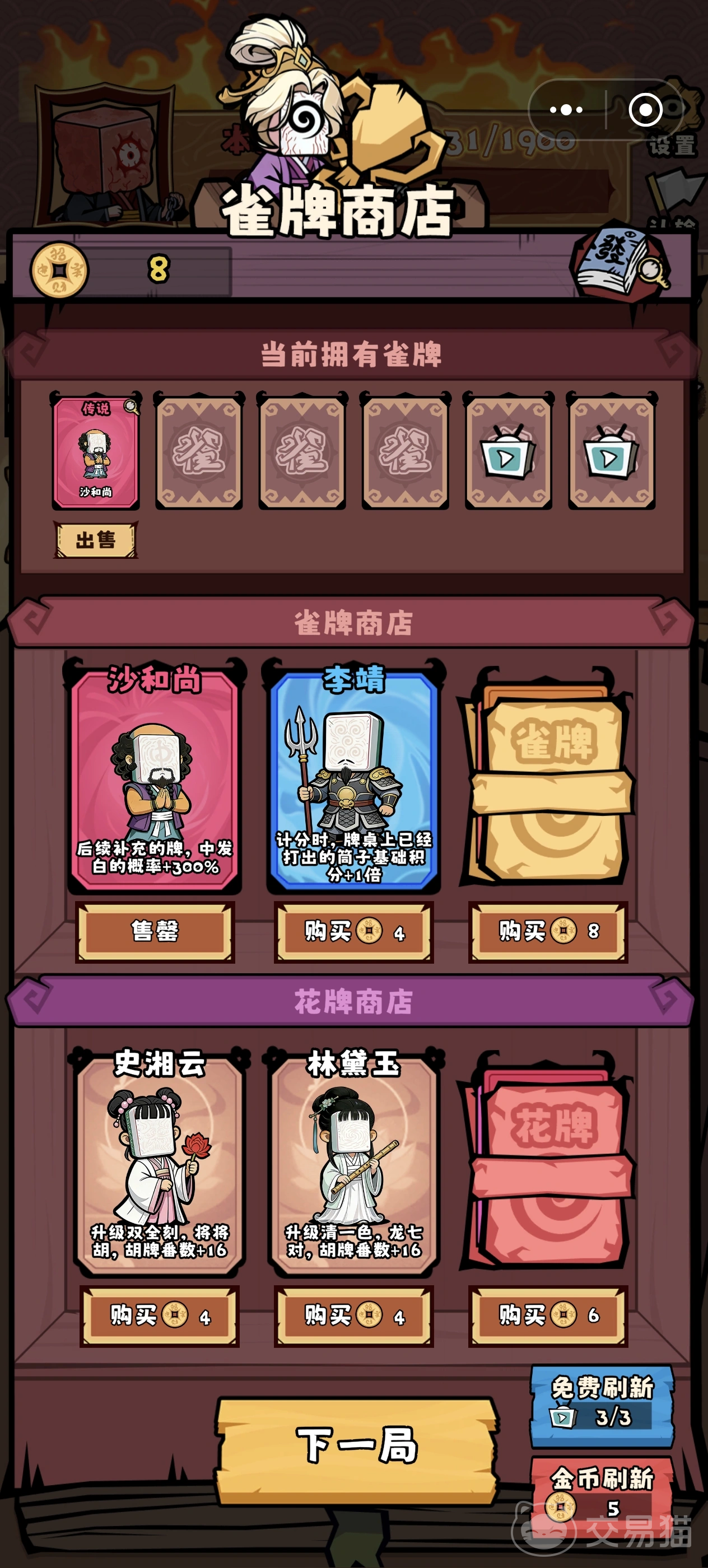 角色系统融合东方志怪体系,沙和尚、关二爷、林黛玉等人物均具备差异化被动技能。例如沙和尚使后续补牌中“中、发、白”出现概率提升300%;与孙行者、猪八戒协同可大幅提高十三幺成型率;林黛玉则为清一色牌型额外增加番数,助力高分突破。角色间存在明确协同逻辑,需结合牌局节奏进行策略预判与搭配。