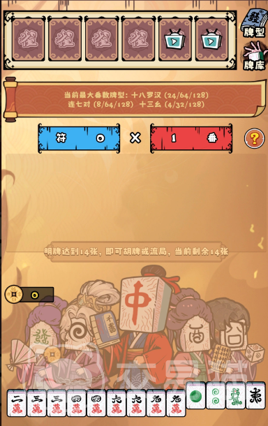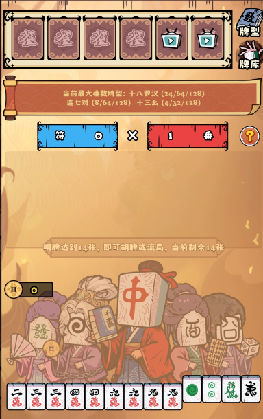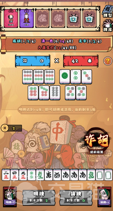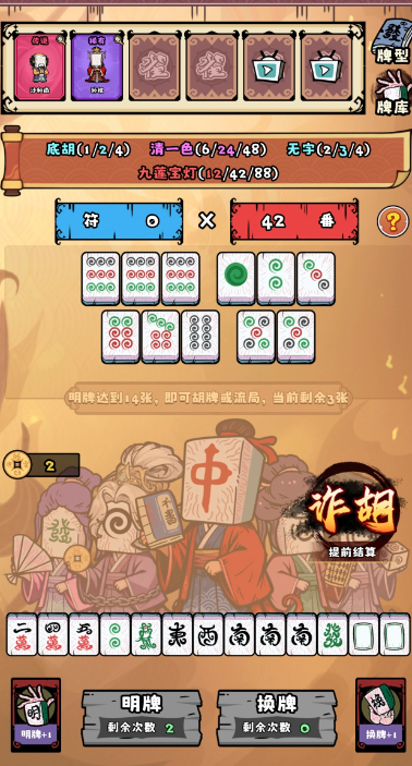 每局开始时,玩家拥有5次明牌与换牌机会。换牌即主动弃置任意数量手牌,系统等量补发新麻将牌;明牌则为将选定牌置入公共牌区,用于构建目标胡型。通过动态调整手牌结构,逐步达成清一色、七对、十三幺等高番型,并以最终得分超越关卡基准线判定通关。