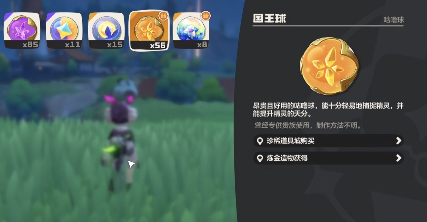 高级咕噜球是中期主力捕捉工具,综合性价比突出。主要获取途径包括安妮商店直接购买(最稳定)、主线推进奖励、等级提升成就、赛季活动及通行证任务发放。系别专精咕噜球需在炼金台以普通咕噜球加对应属性矿石合成,亦可通过成功捕捉指定属性精灵并提交战报获得返还奖励。国王咕噜球为终极捕捉保障,强制生效且不消耗概率机制,建议常备于背包以防突发稀有精灵遭遇。其合成公式为:10个损坏的国王咕噜球→1个完整国王咕噜球。损坏球来源涵盖周常副本、华丽宝箱、世界Boss掉落,亦可在远行商人处兑换,或通过月卡、赛季通行证及充值活动获取。