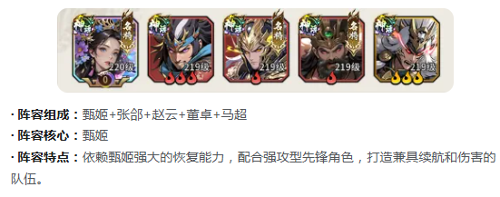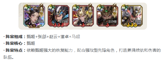 【鼓舞强弓流】强调生存韧性与容错率,甄姬作为核心治疗者,提供稳定群体回复与状态净化。张郃(远程压制)、赵云(突进输出)、董卓(物理承伤)、马超(高频打击)共同构成攻守均衡的四维结构。甄姬确保全队血线健康,董卓稳固前排防线,赵云与马超分担中后排输出压力,整套配置在各类PVE挑战与长期拉锯战中表现尤为可靠。
