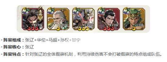 【夜袭敌营流】侧重先手控制与节奏压制,张辽为核心控制点,华佗(持续治疗+解控)、马超(破甲追击)、孙权(增益扩散)、甘宁(高频伤害)形成闭环。张辽开局释放全体假寐,大幅降低敌方行动频率;马超与甘宁借此窗口期持续输出并叠加伤害加成,实现全程压制。该阵容对高爆发、低控制抗性队伍具备显著克制效果,适用于竞技场针对性布阵。