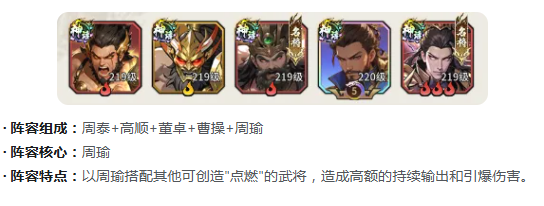 【火神降世流】主打持续灼烧与连锁引爆机制,周瑜为绝对核心输出。辅以高顺(施加点燃)、董卓(双抗+控场)、周泰(点燃叠加+前排续航)、曹操(辅助增益)。该体系通过多角色协同挂点燃Debuff,由周瑜触发高额持续伤害及引爆效果,配合董卓与周泰组成的双前排结构,保障输出环境稳定,适合中后期持久战与高难度副本攻坚。