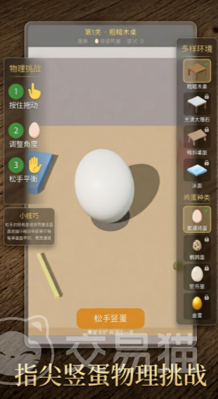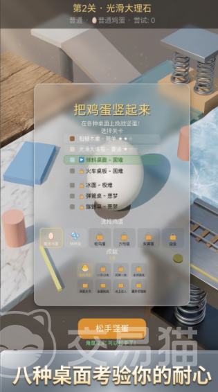 游戏全程无时间压力,不设失败惩罚机制,也不存在传统意义上的“生命值”或“能量条”。每一关仅需完成一次有效竖立即可推进。但难度并非静止不变——共包含八种物理特性差异显著的桌面材质,例如光滑玻璃、粗粝砂岩、弹性橡胶等,每种材质对鸡蛋底部接触点的摩擦力与形变反馈均不同,直接影响竖立所需的倾角范围与稳定性窗口。