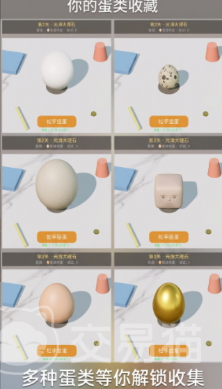 游戏中可解锁并切换使用的蛋类超过十种,涵盖新鲜鸡蛋、陈年鸡蛋、双黄蛋、鸭蛋、鹌鹑蛋等。不同蛋类因内部质心高度、壳体曲率及质量分布存在差异,导致其静态平衡临界角各不相同。例如,存放天数较短的新鲜鸡蛋重心偏低,更易维持直立;而存放时间延长后,气室增大、重心上移,竖立难度同步提升。随着关卡推进,玩家将逐步解锁新蛋种,并将其录入图鉴系统,满足收集型用户的成就驱动需求。