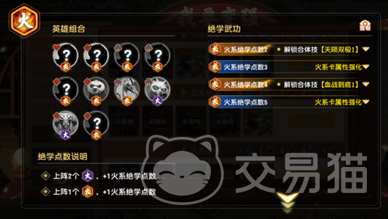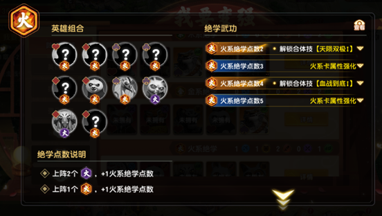 ④火系绝学(含火系绝学·残):共10名英雄,满羁绊需累计5点绝学值(1名完整火系=1点,2名火系·残=1点)